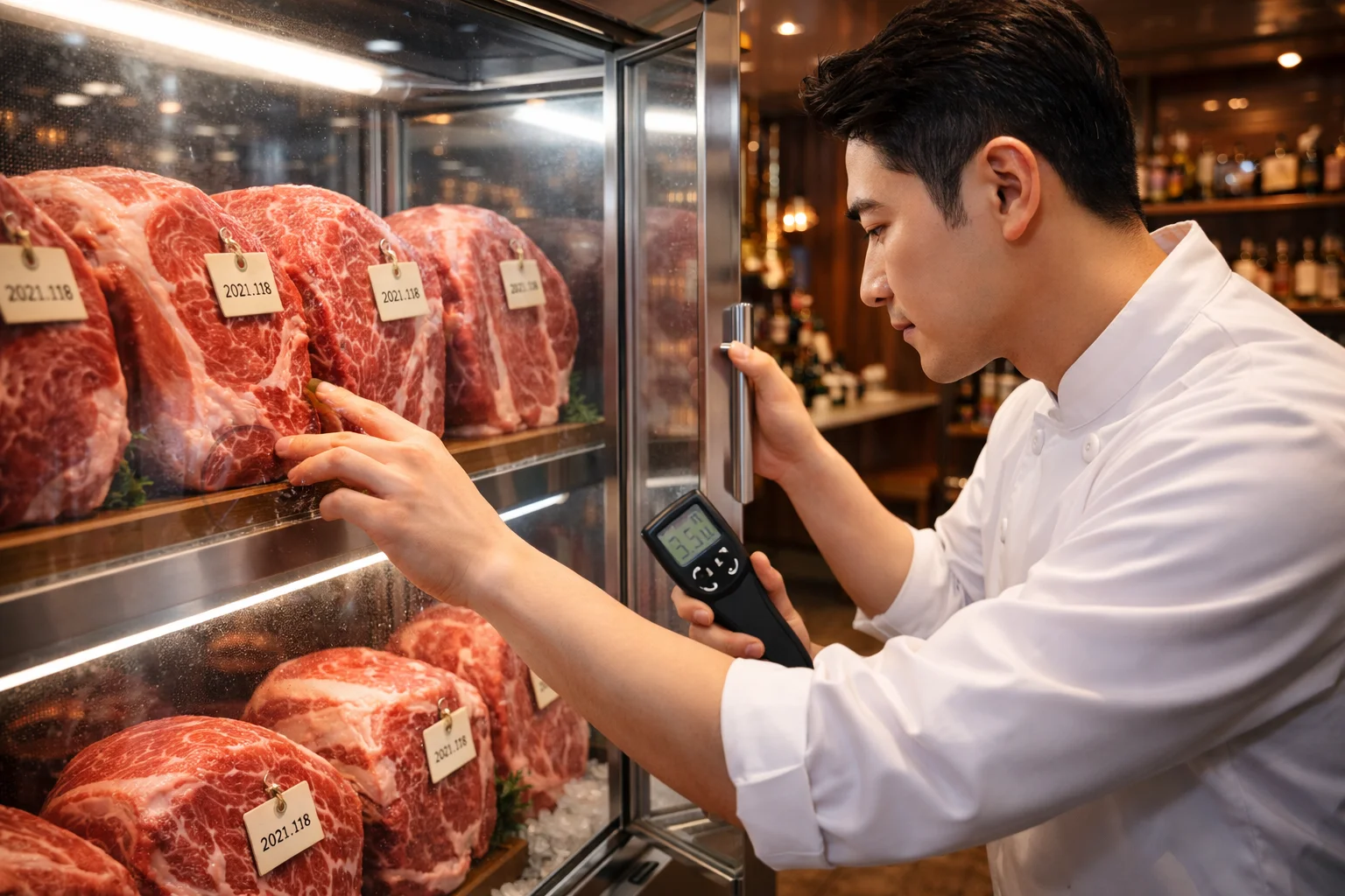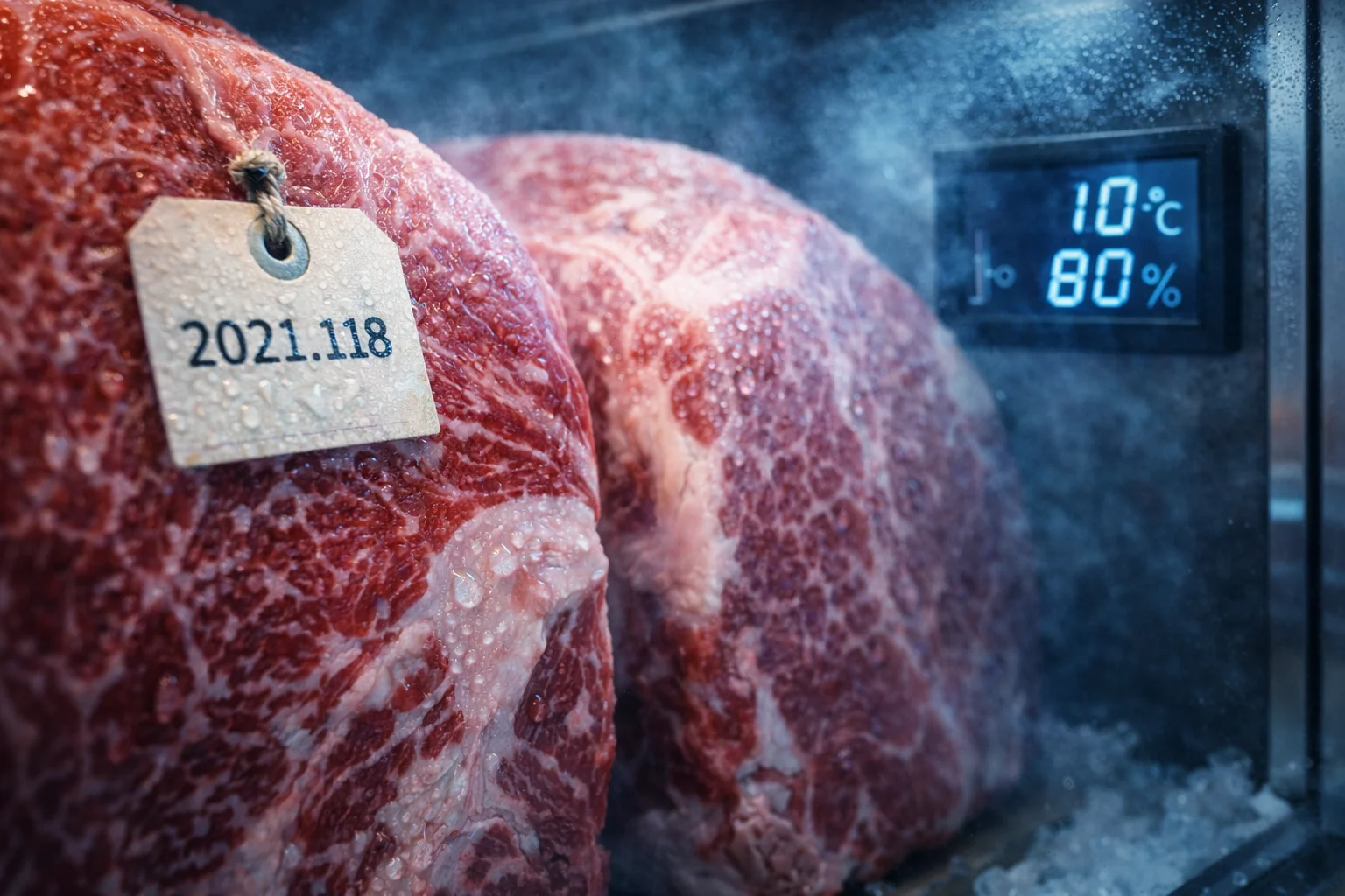 원육 내부의 효소가 활발하게 작용하여 맛을 깊게 만드는 과정은 사실 아주 예민한 과학의 영역이에요. 보통 영하 1도에서 영상 2도 사이의 매우 좁은 온도 범위를 일정하게 유지해야 하는데요.