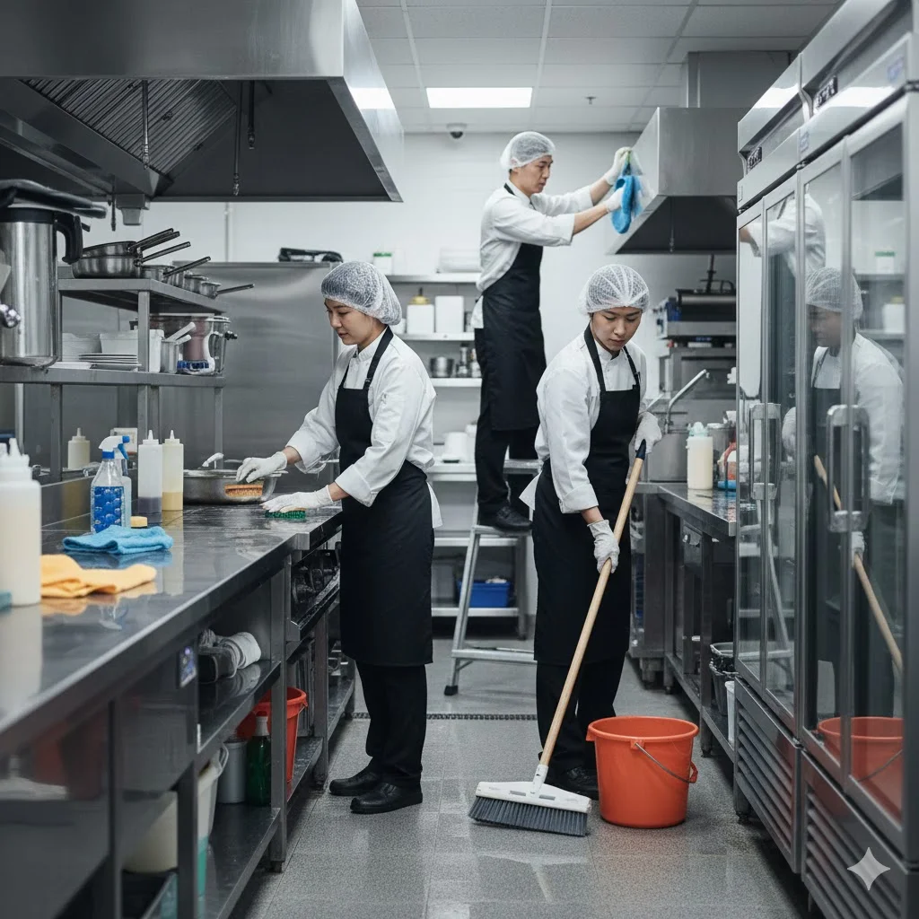 선반 및 바닥 | 식재료에서 떨어진 부스러기나 국물 자국을 즉시 제거하세요. | 매일 마감 시 |