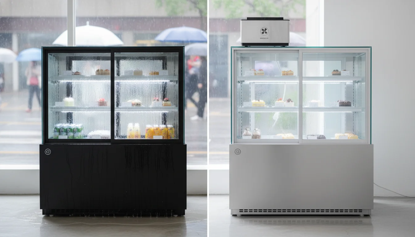 외부의 습한 공기와 내부의 찬 공기가 만나면 유리 표면에 물방울이 맺힐 수밖에 없는 구조입니다.이런 쇼케이스는 매장의 청결한 이미지를 해칠 뿐만 아니라, 전기 안전사고의 위험도 있습니다.