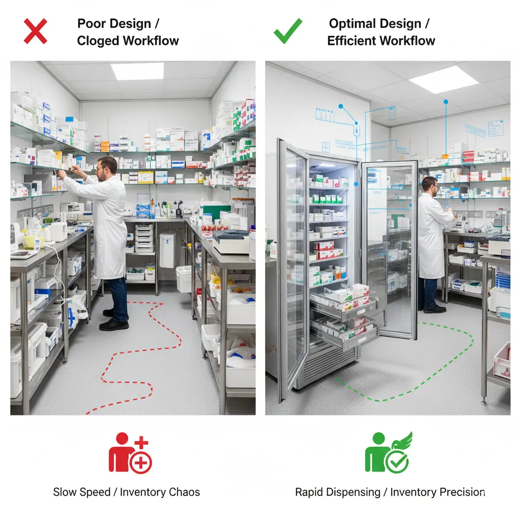 좁은 조제실 공간에서 조제 속도와 재고 관리 효율을 동시에 높이려면 어떤 설계를 고려해야 하나요?