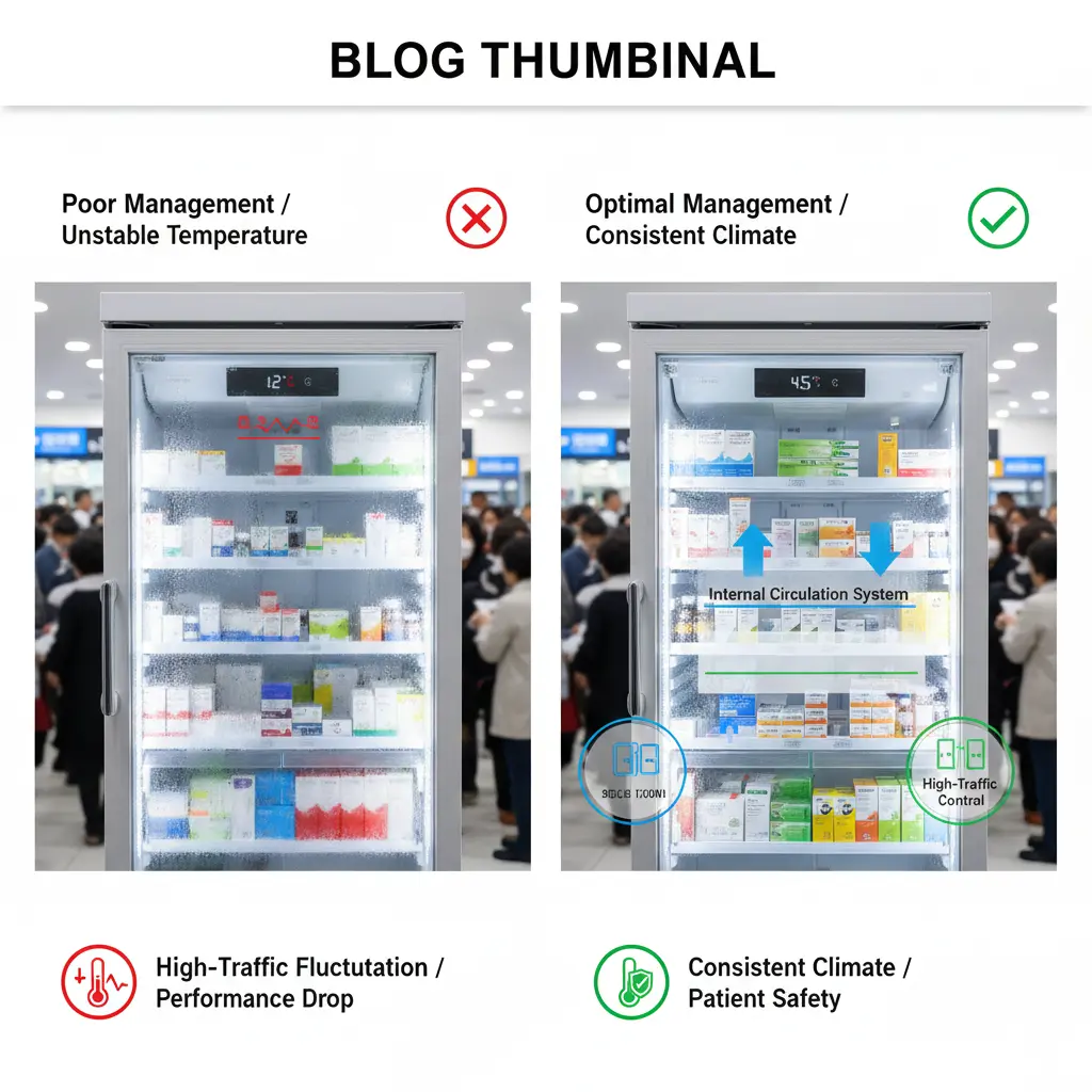 투약과 조제가 빈번한 시간에는 냉장고 문이 수시로 열리게 되며, 이때 내부 온도가 출렁이는 현상은 약품의 역가 유지에 치명적인 영향을 줄 수 있습니다.