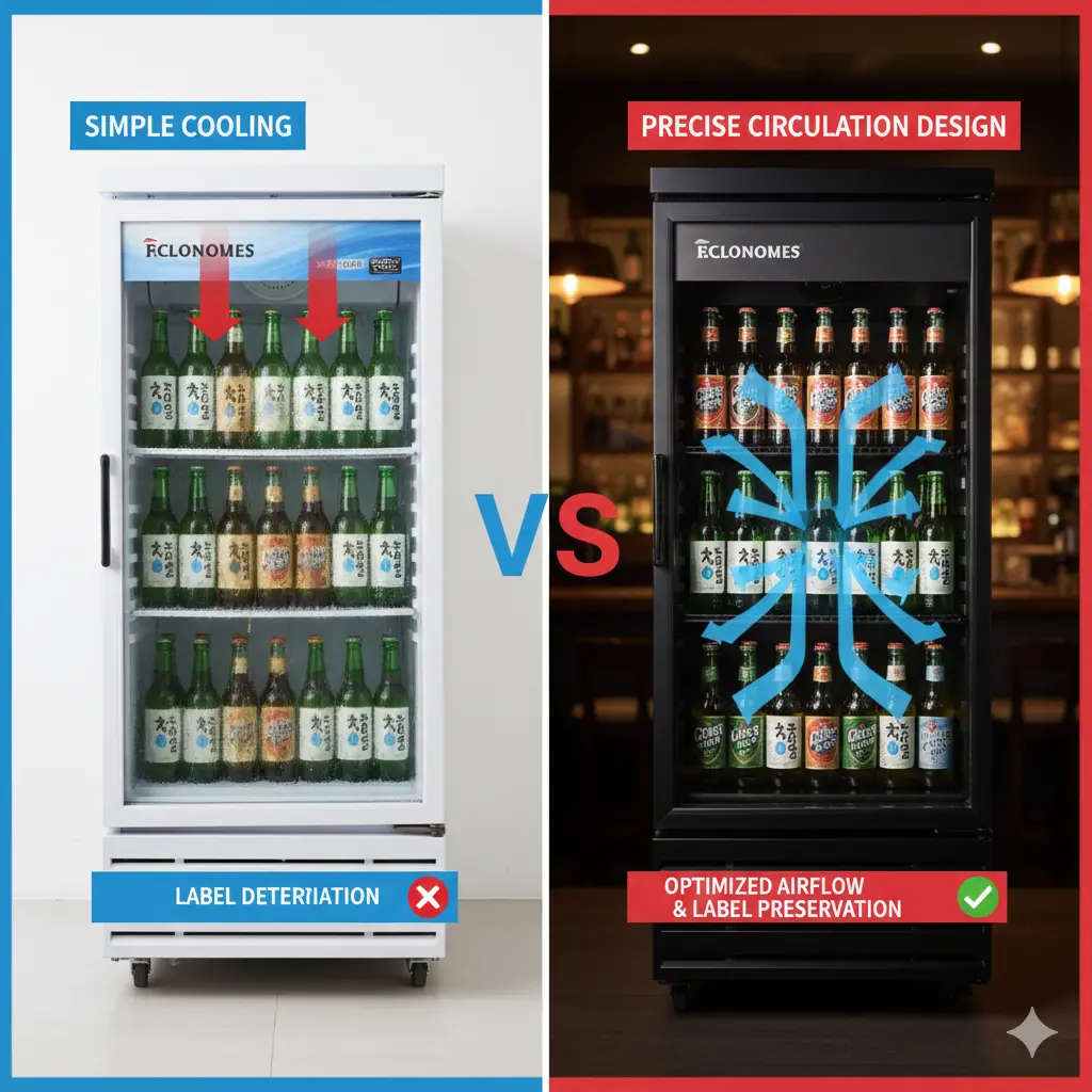 이런 장비들은 고온다습한 한국의 여름철 기후를 만나면 유리 표면에 이슬이 맺히는 결로 현상을 해결하지 못해, 주류 라벨의 가시성을 심하게 해치는 구조적 한계를 보입니다.