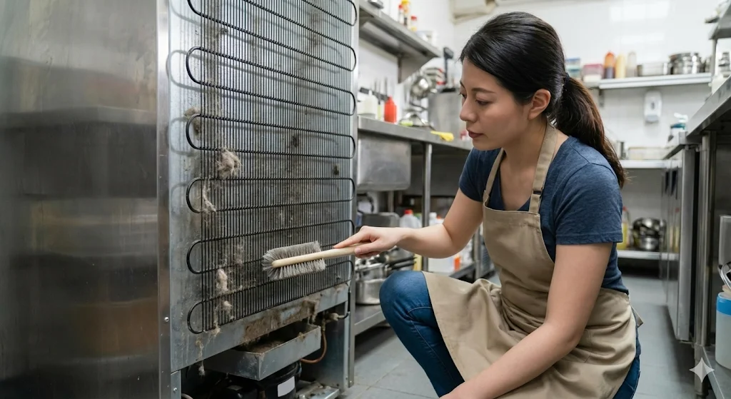 응축기(필터) 청소: 기계실 뒤쪽 필터에 먼지가 쌓이면 냉각 효율이 뚝 떨어집니다. 한 달에 한 번 먼지만 털어줘도 업소용 냉장고 전기세 절감에 큰 도움이 됩니다.