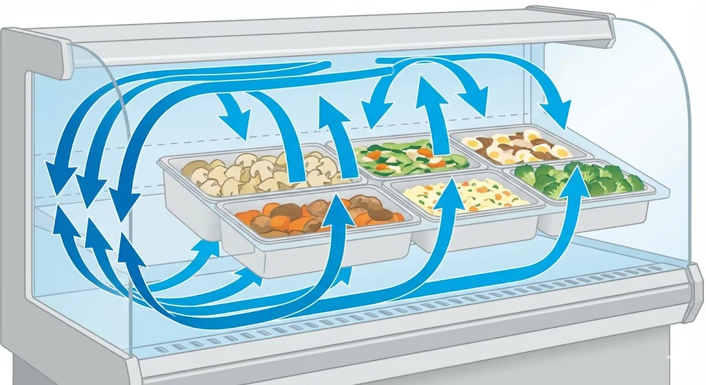 업소용 반찬냉장 쇼케이스 내부에서 공기가 어떻게 움직이느냐에 따라 반찬의 '생명력'이 달라집니다. 공기 흐름이 중요한 이유는 크게 세 가지로 요약할 수 있습니다.