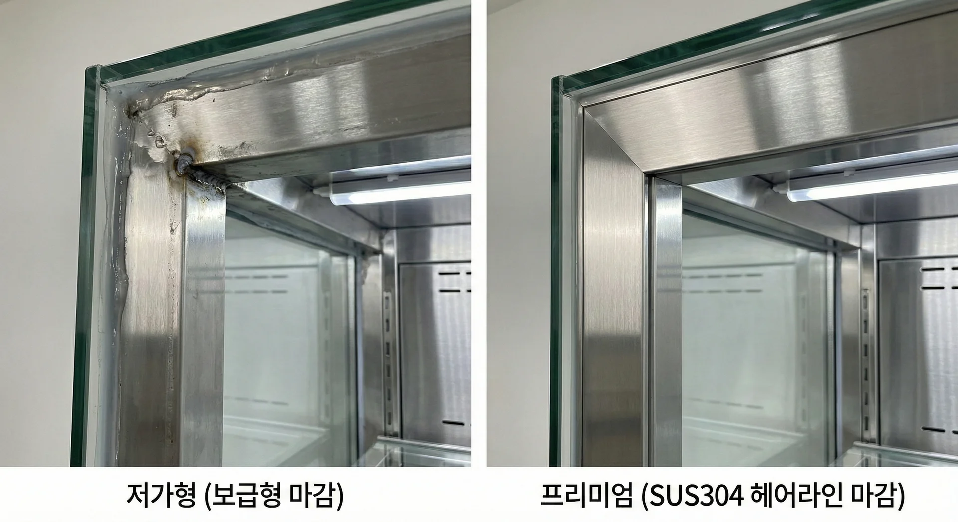 결론부터 말씀드리면, 저가형 업소용 쇼케이스는 제작 단가를 낮추기 위해 눈에 보이지 않는 내부 자재에서 타협하는 경우가 많습니다.