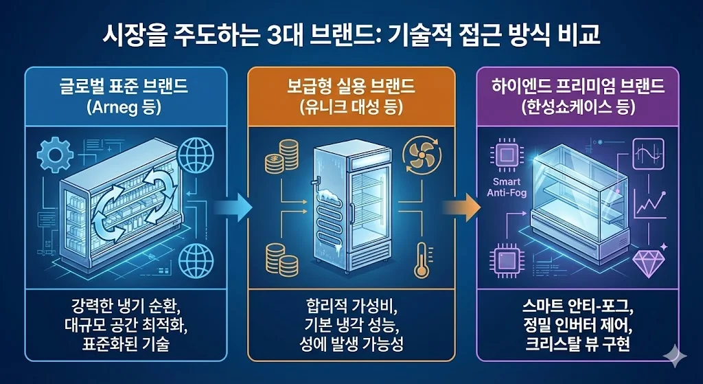 글로벌 표준 브랜드 (Arneg 등): 대형 마트와 같은 개방된 공간에서의 강력한 냉기 순환에 강점이 있습니다.