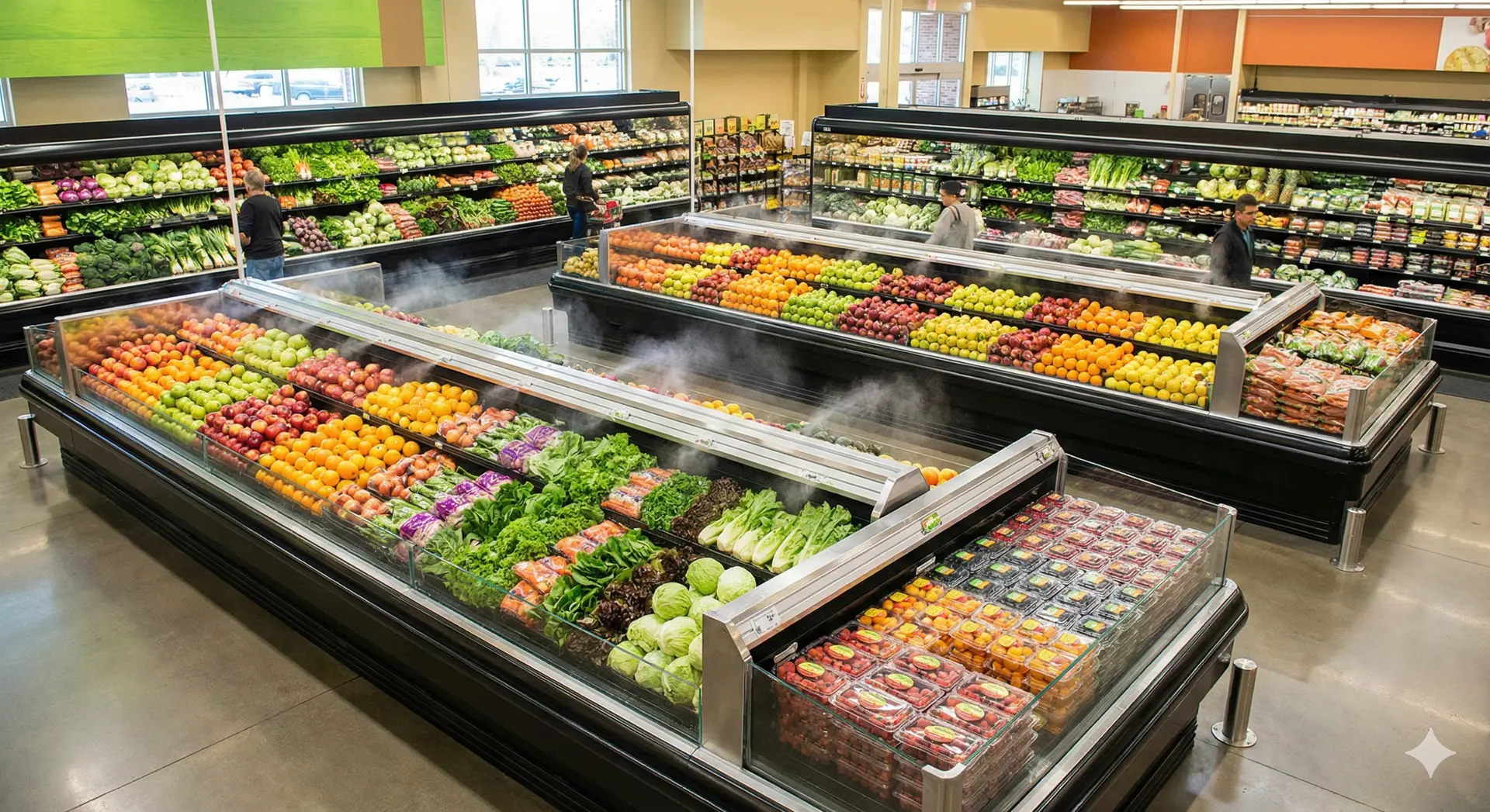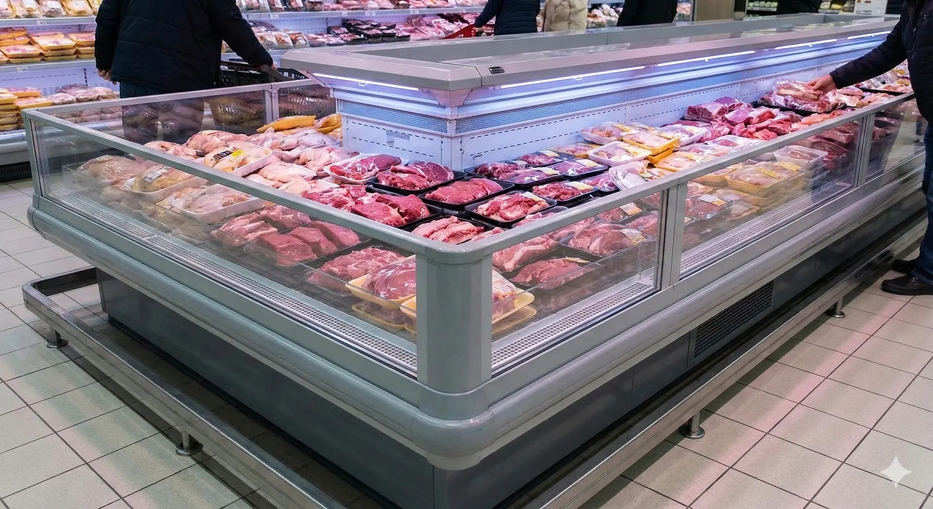 평대형 오픈형냉장고 (Island/Flat-top): 허리 높이의 낮은 구조로 매장 중앙에 배치됩니다. 정육, 수산물, 냉동식품 등을 대량으로 쌓아두고 판매할 때 유리하며 고객의 시야를 가리지 않아 매장이 넓어 보이는 효과가 있습니다.