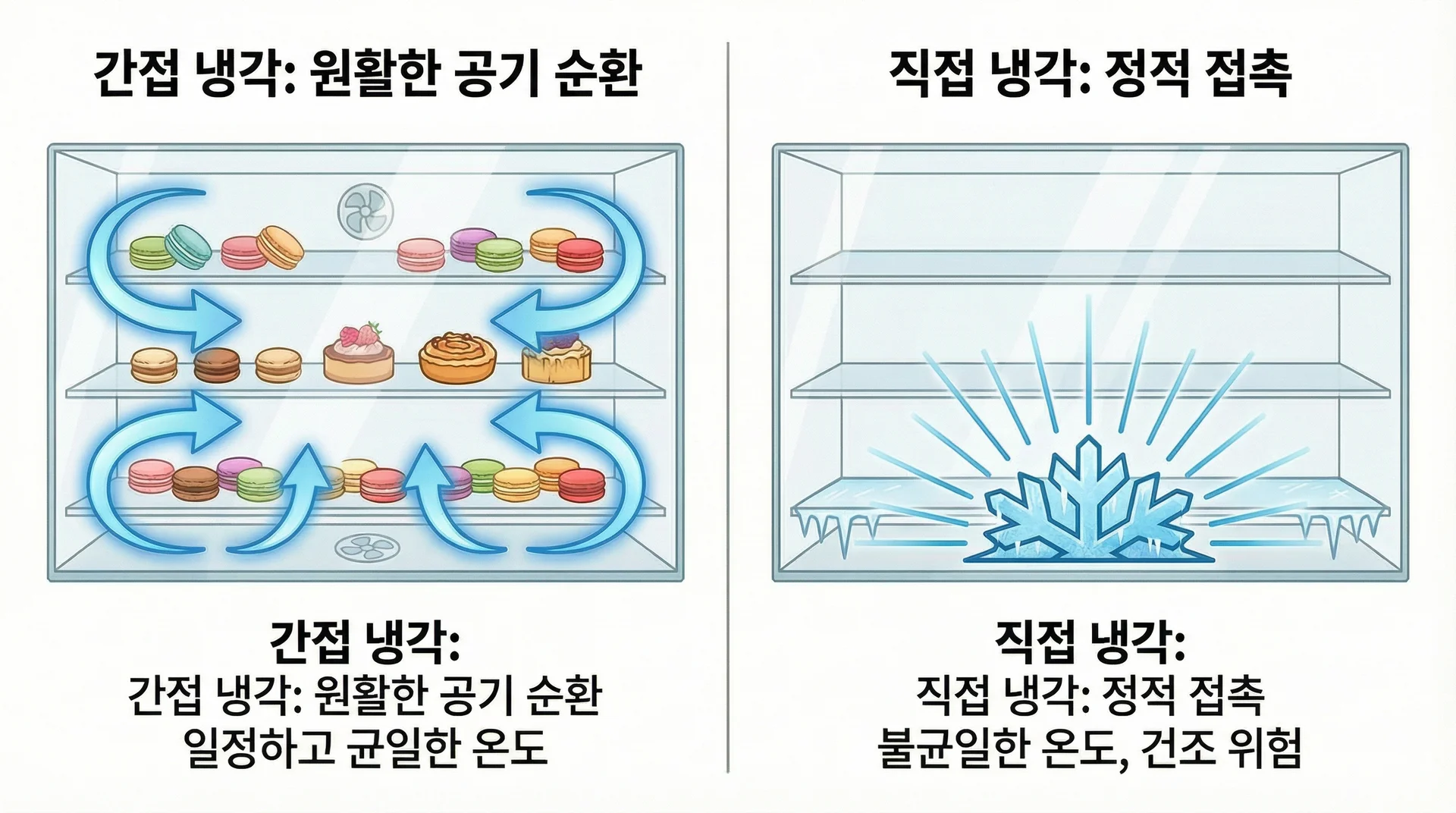 특징 | 성에가 발생할 수 있음 | 온도 편차가 적고 성에 없음 |
