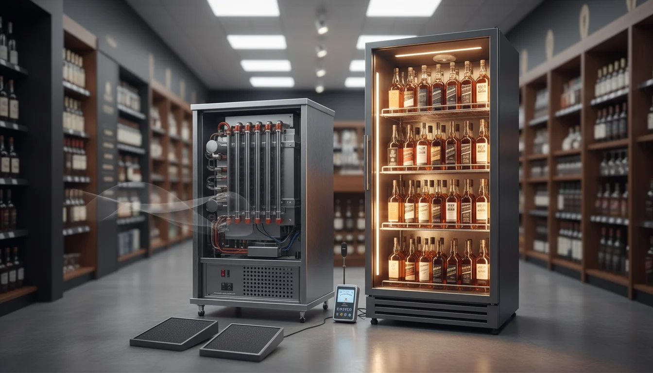 일반 가구장이 술을 '방치'하는 수준이라면, 한성쇼케이스는 술을 '케어'합니다. 엔젤스 쉐어(Angel's Share)는 오크통에서 끝내야지, 병 안에서 증발이 일어나게 해서는 안 됩니다.Q2. 저가형 업소용 냉장고를 위스키 진열대로 쓰면 안 될까요? (진동과 소음 비교)