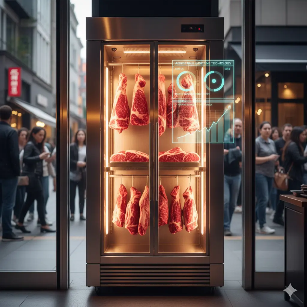 매장 입구에 배치된 고기숙성냉장고 는 고객에게 "우리는 최고급 원육을 직접 숙성해서 대접한다"는 강력한 마케팅 메시지를 전달합니다.