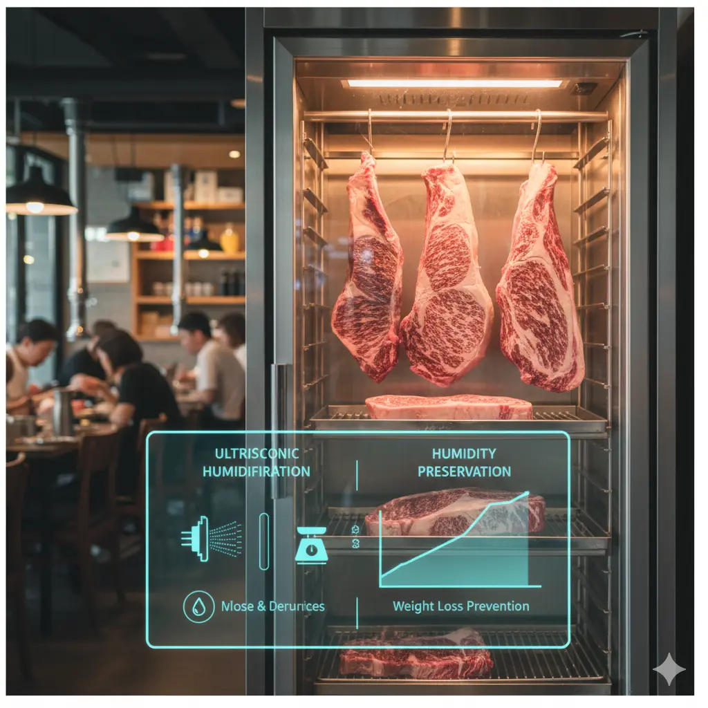 Q3. 원육의 무게 손실을 막고 선도를 유지하는 고기숙성냉장고 의 '초음파 미세 가습' 및 습도 보존 기술의 원리는 무엇인가요?