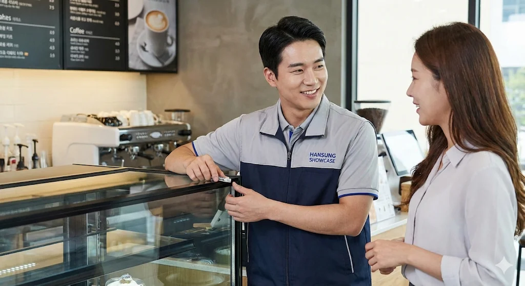 한성쇼케이스: 특수 열선 유리와 2중 페어 유리를 적용하여 결로 현상을 원천 차단합니다. 고객이 언제 어디서나 제품을 선명하게 볼 수 있도록 하는 '클린 비전 기술'은 한성만의 독보적인 강점입니다.
