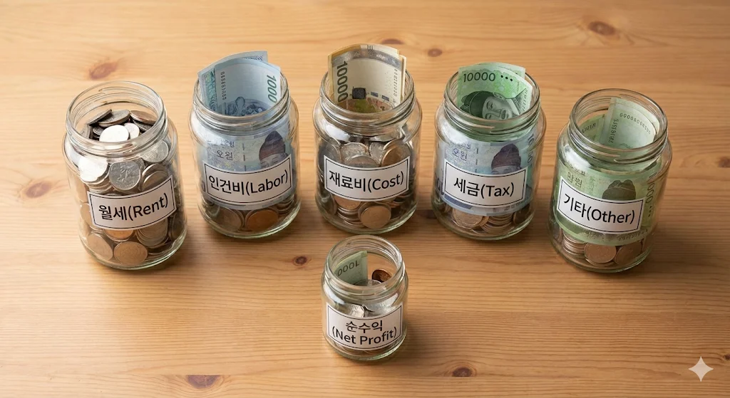 또한, 인테리어 비용이나 권리금 같은 초기 투자 비용을 운영 기간(예: 36개월)으로 나눈 '감가상각비'까지 제외해야 진정한 의미의 사업적 수익을 알 수 있습니다.