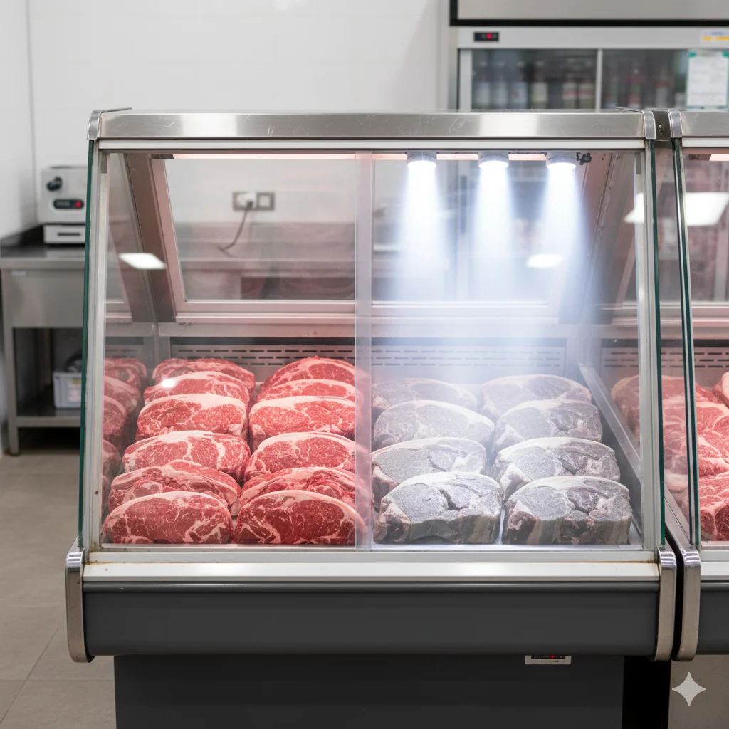 저가형이나 오래된 중고 브랜드는 열 방출이 심한 구형 LED를 쓰는데, 이 조명 열기가 고기 표면의 단백질을 미세하게 익히며 색을 변하게 하는 갈변 현상을 가속화합니다.