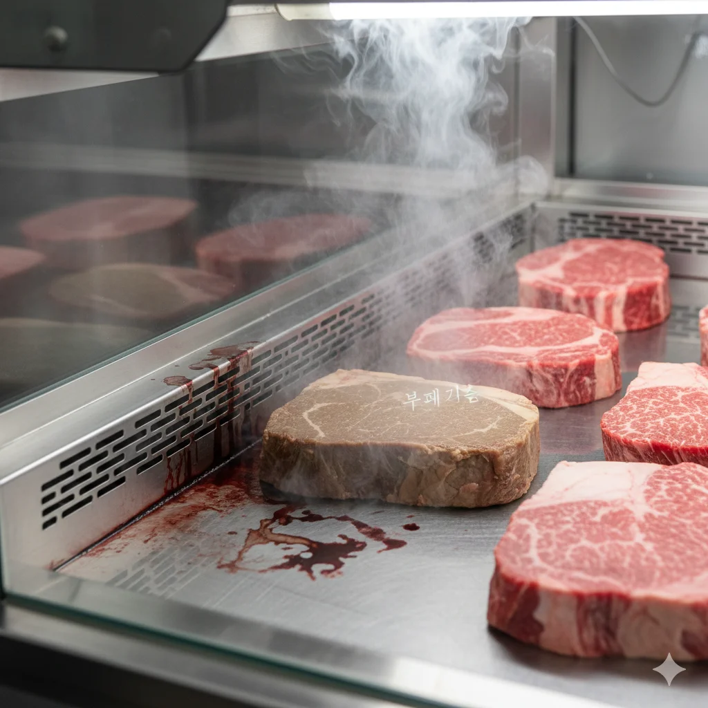 여기서 발생하는 미세한 부패 가스는 쇼케이스 내부를 순환하며 사장님의 신선한 고기에 달라붙어 산화를 촉진하고 쿰쿰한 잡내를 배게 만듭니다.