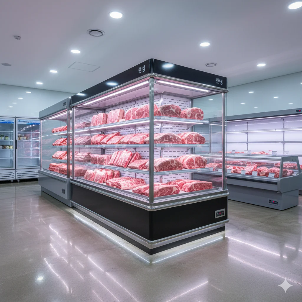 TOP 1 | 하이엔드 제작 (한성쇼케이스) | 수분 박제 기류, 고연색 광학 설계, 무소음 | 프리미엄 정육점, 한우 전문점 |