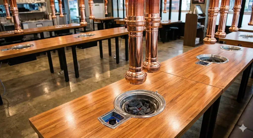 고깃집 인테리어에서 가장 큰 돈이 들어가는 곳은 바닥 공사와 환기(닥트) 시스템입니다.