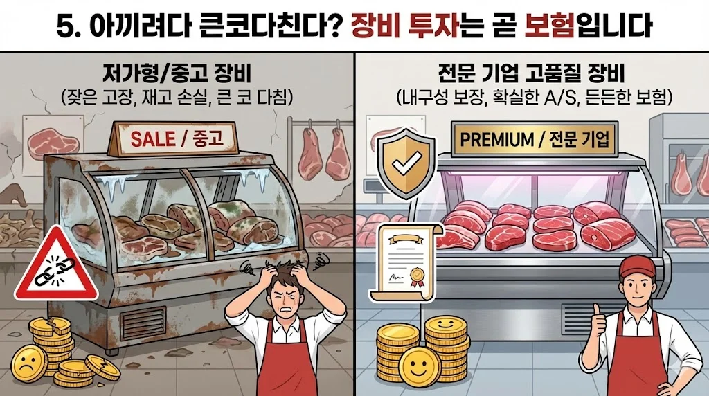 하지만 고가의 원육을 다루는 정육 비즈니스에서 냉장고 고장은 곧 막대한 재고 손실로 직결된다는 사실을 명심해야 합니다. 한 번의 고장으로 날리는 고깃값이 장비 값 차액보다 훨씬 큰 경우가 비일비재하니까요.