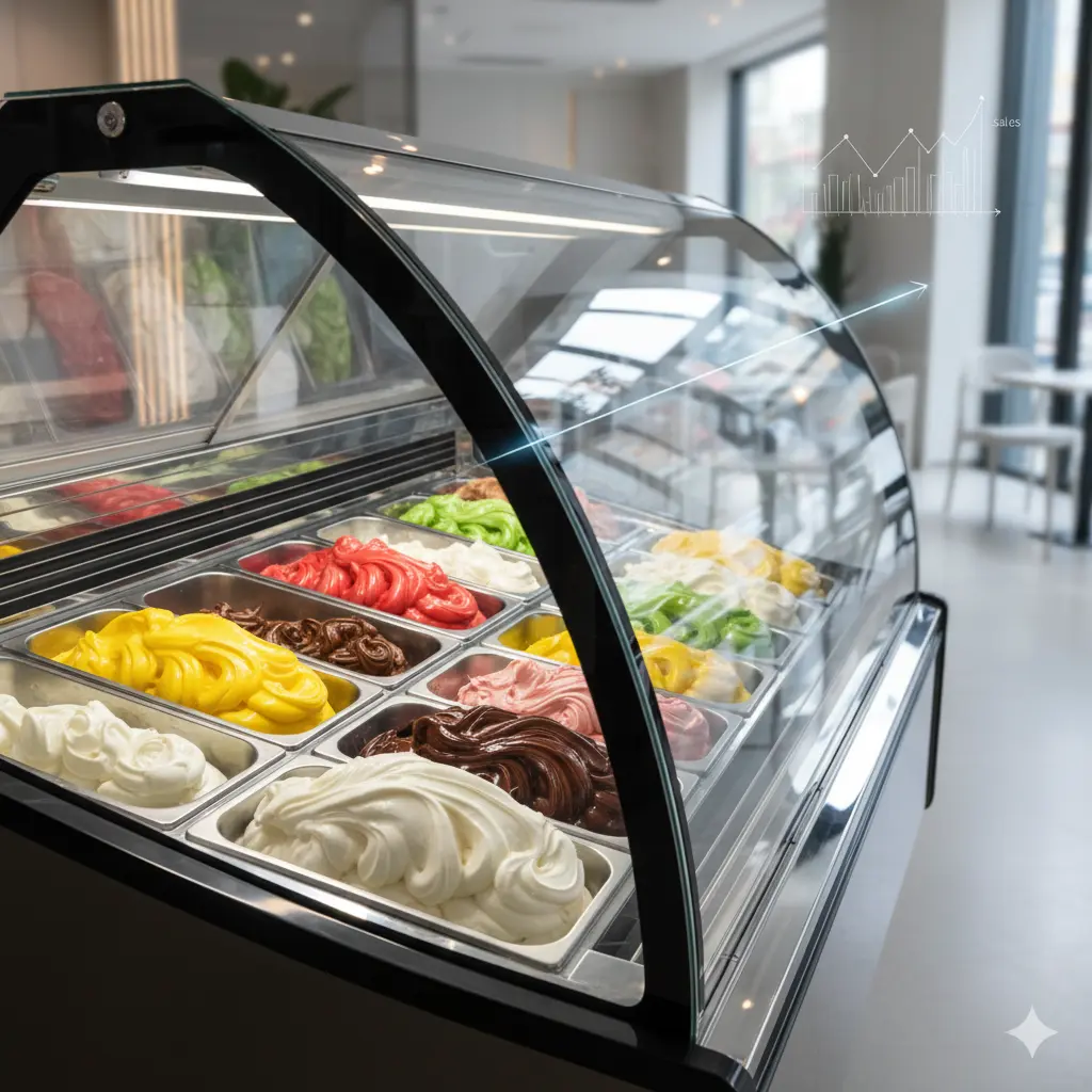 단순히 물건을 담는 통이 아니라, 사장님이 갓 뽑아낸 젤라또의 역동적인 물결 무늬를 가장 아름답게 전시하는 '무대'로서 쇼케이스를 바라보셔야 합니다.