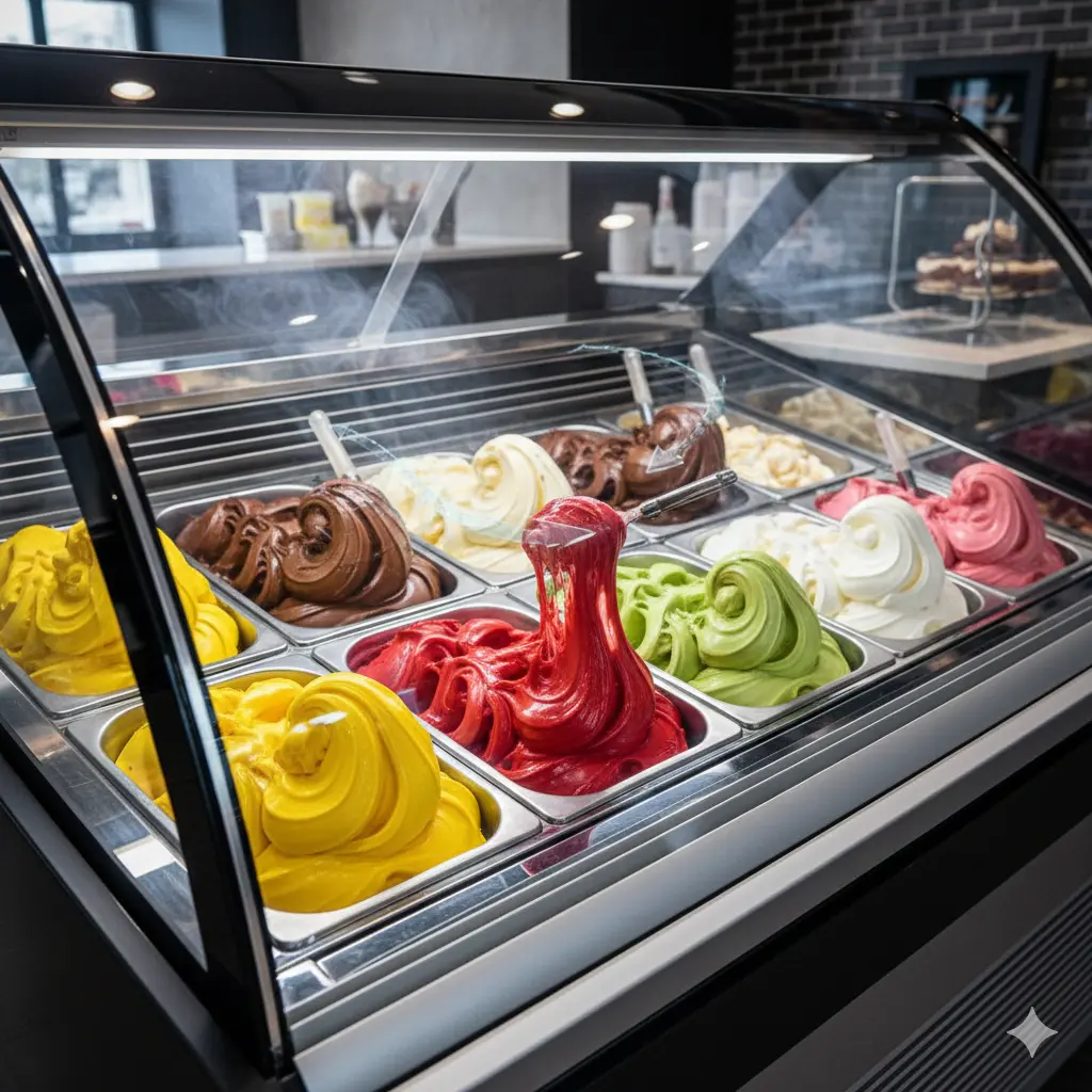 젤라또는 일반 아이스크림보다 공기 함량(Overrun)이 적고 유지방이 낮아 온도와 습도 변화에 극도로 예민하며, 이는 곧 장비의 기술력이 맛과 멋을 결정한다는 뜻입니다.