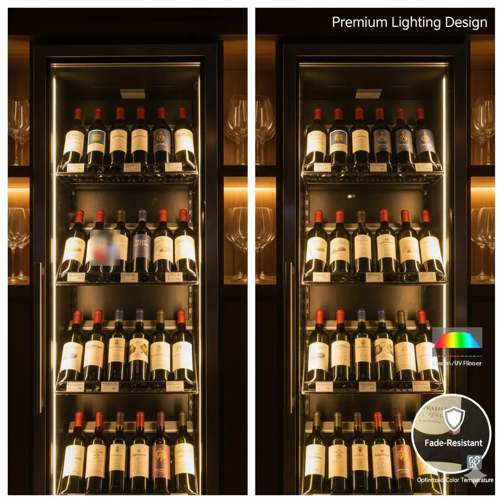 심미적인 아름다움이 와인의 가치를 높이되, 그 빛이 액체의 성질을 건드리지 않는 정교한 조명 공학이 적용되어야 진정한 프리미엄이라 할 수 있습니다.