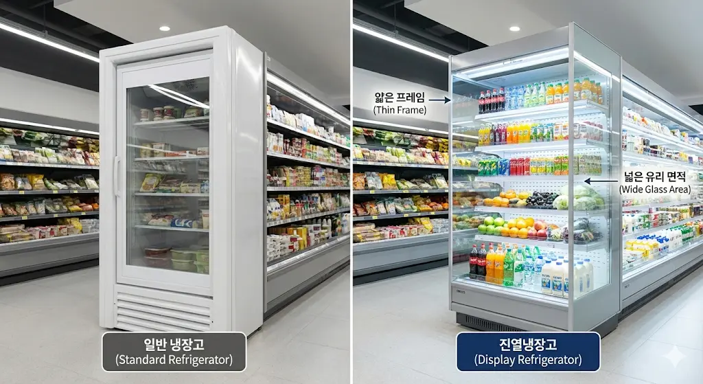 일반적인 냉장고와 달리 진열냉장고는 도어프레임이 얇고 유리 면적이 넓어 시인성이 탁월합니다.