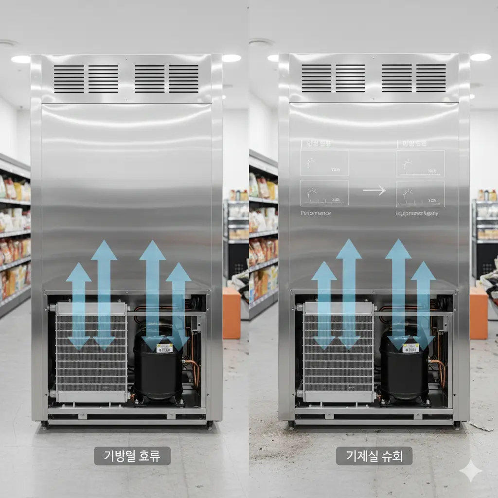 쇼케이스 하단 기계실에서 발생하는 열기가 매장 내부로 재유입되는 현상은 압축기의 토출 압력을 높여 전기료 상승과 부품 마모를 가속화합니다.
