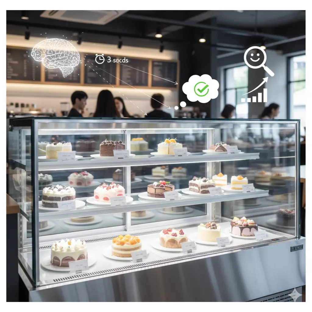 유리 너머의 디저트가 마치 손을 뻗으면 바로 닿을 듯한 입체감을 줄 때, 고객은 가격표보다 상품의 질감에 집중하게 되고 이는 곧 즉각적인 구매로 이어집니다.