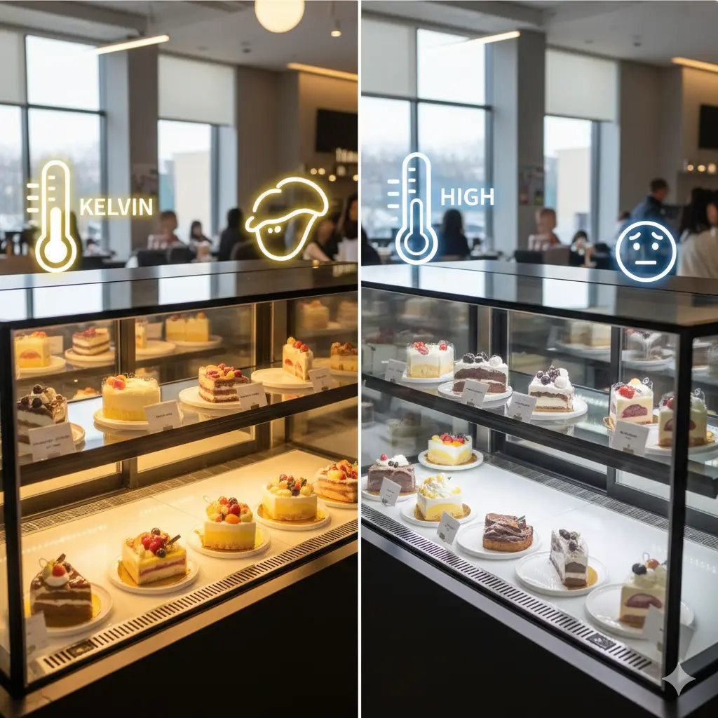 Q3. 색 온도가 단맛을 결정한다? 카페냉장쇼케이스 속 '켈빈(Kelvin) 최적화' 라이팅과 구매 심리 마케팅의 비밀은?