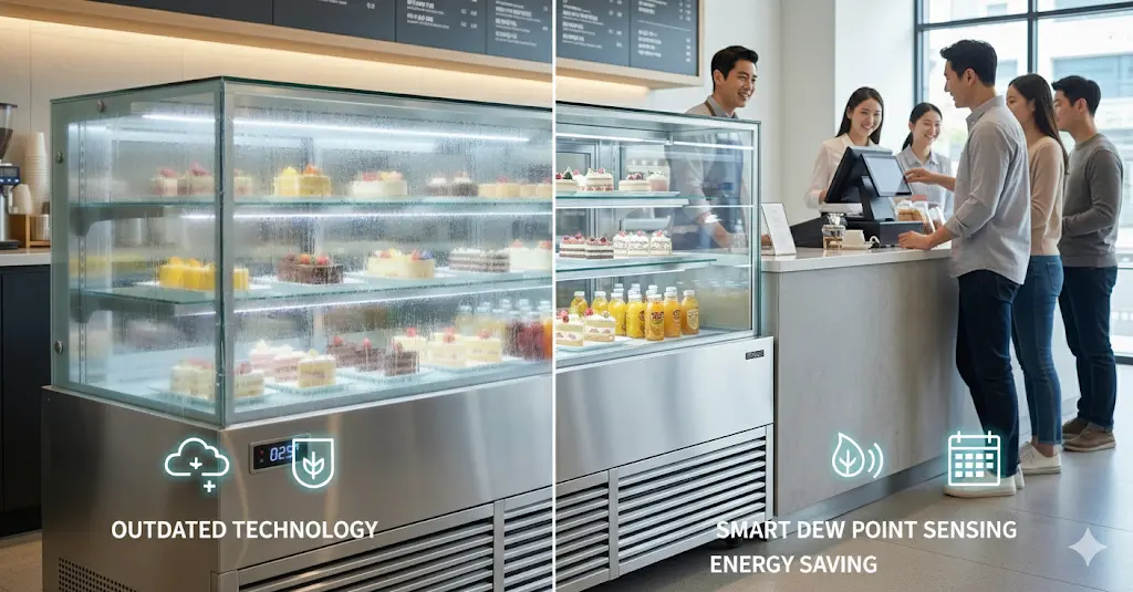 Q4. 365일 맑은 시야를 약속하는 카페냉장쇼케이스 의 '지능형 이슬점 센싱'과 에너지 세이빙 위기 관리 기술은?