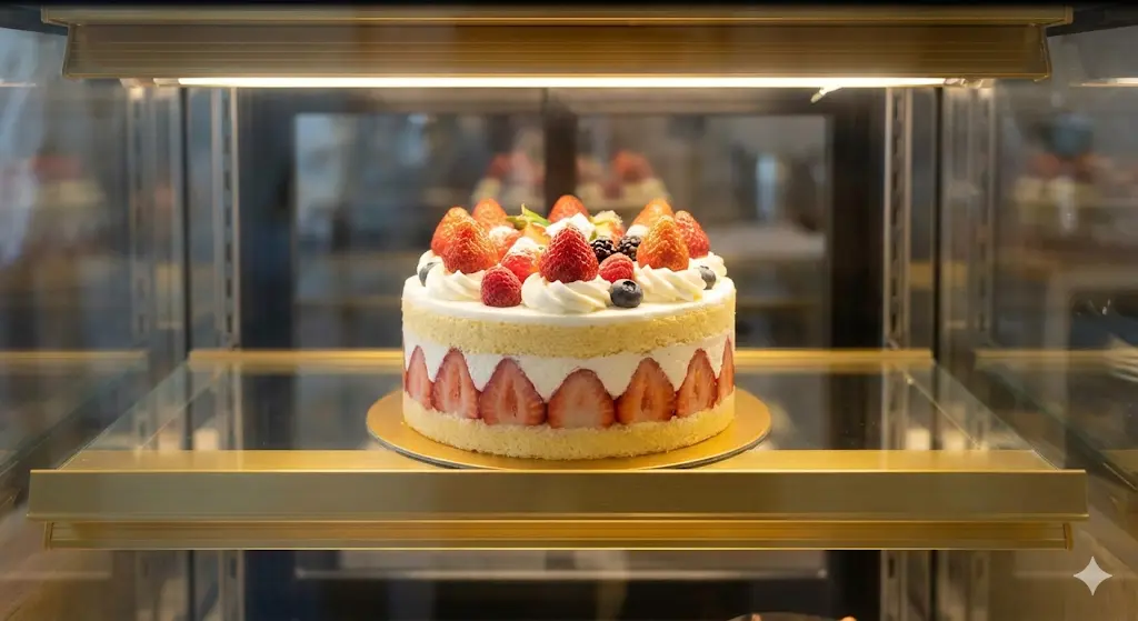 보색 대비 활용: 초록색 잎 데코레이션이나 붉은색 딸기를 적절히 섞어 진열하면 시각적 자극이 극대화되어 고객이 메뉴판보다 쇼케이스를 먼저 보게 됩니다.