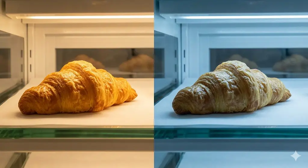 따뜻한 색감의 유혹: 빵이나 구움과자류는 전구색(웜톤) 조명 아래에서 훨씬 먹음직스럽게 보입니다. 반면 청량한 에이드나 콜드브루 원액 등은 주광색(쿨톤) 조명으로 신선함을 강조하는 것이 좋습니다.
