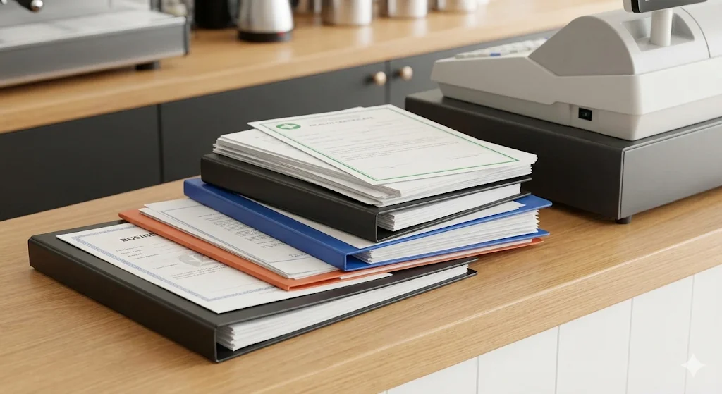 카페 위생점검의 시작은 필수 서류 확인부터입니다. 다음 세 가지는 반드시 매장 내 쉽게 찾을 수 있는 곳에 비치해 두어야 합니다.