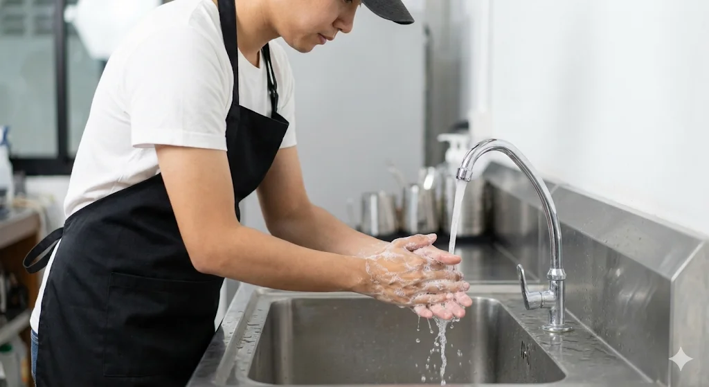 가장 중요한 것은 철저한 손 씻기 생활화입니다. 작업 시작 전, 화장실 이용 후, 쓰레기를 만진 후, 다른 식재료를 다루기 전 등 수시로 올바른 방법으로 손을 씻도록 교육해야 합니다.