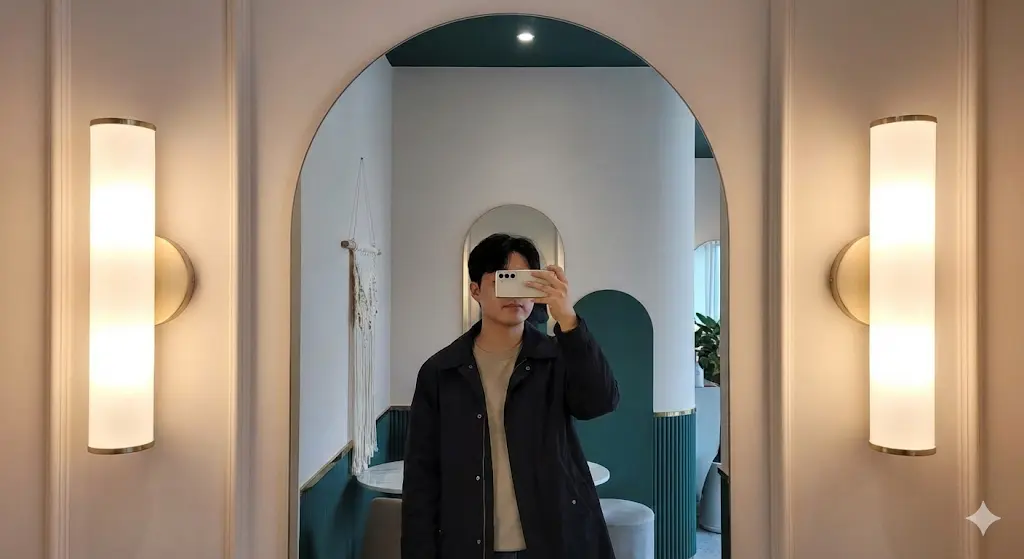눈높이 조명: 거울 셀카를 찍는 공간이라면 조명이 거울 바로 위가 아닌, 사람의 눈높이 측면에서 은은하게 비춰야 합니다.