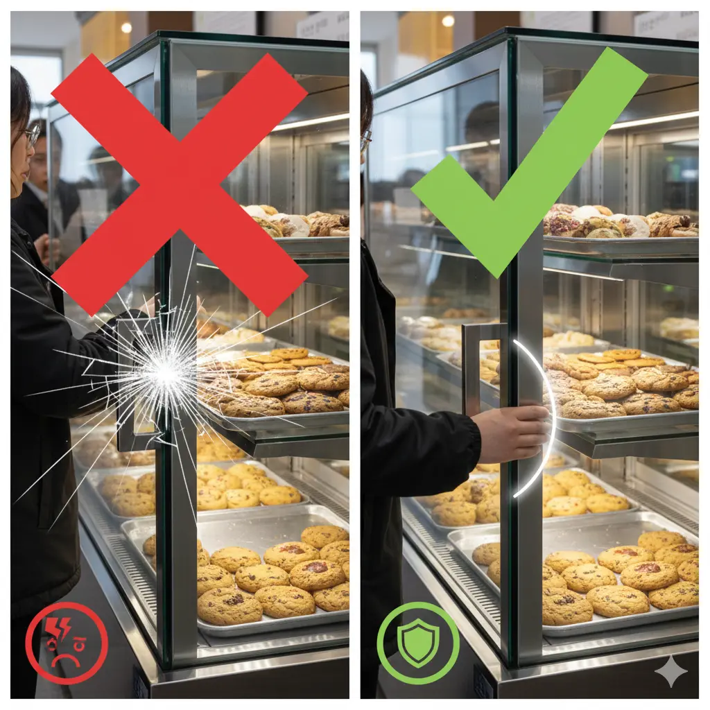 일반 유리보다 5배 이상 강도가 높은 고밀도 강화유리를 사용하고, 도어 경첩 부분에는 충격을 흡수하는 소프트 클로징 시스템을 적용하여 파손 위험을 근본적으로 차단해야 합니다.