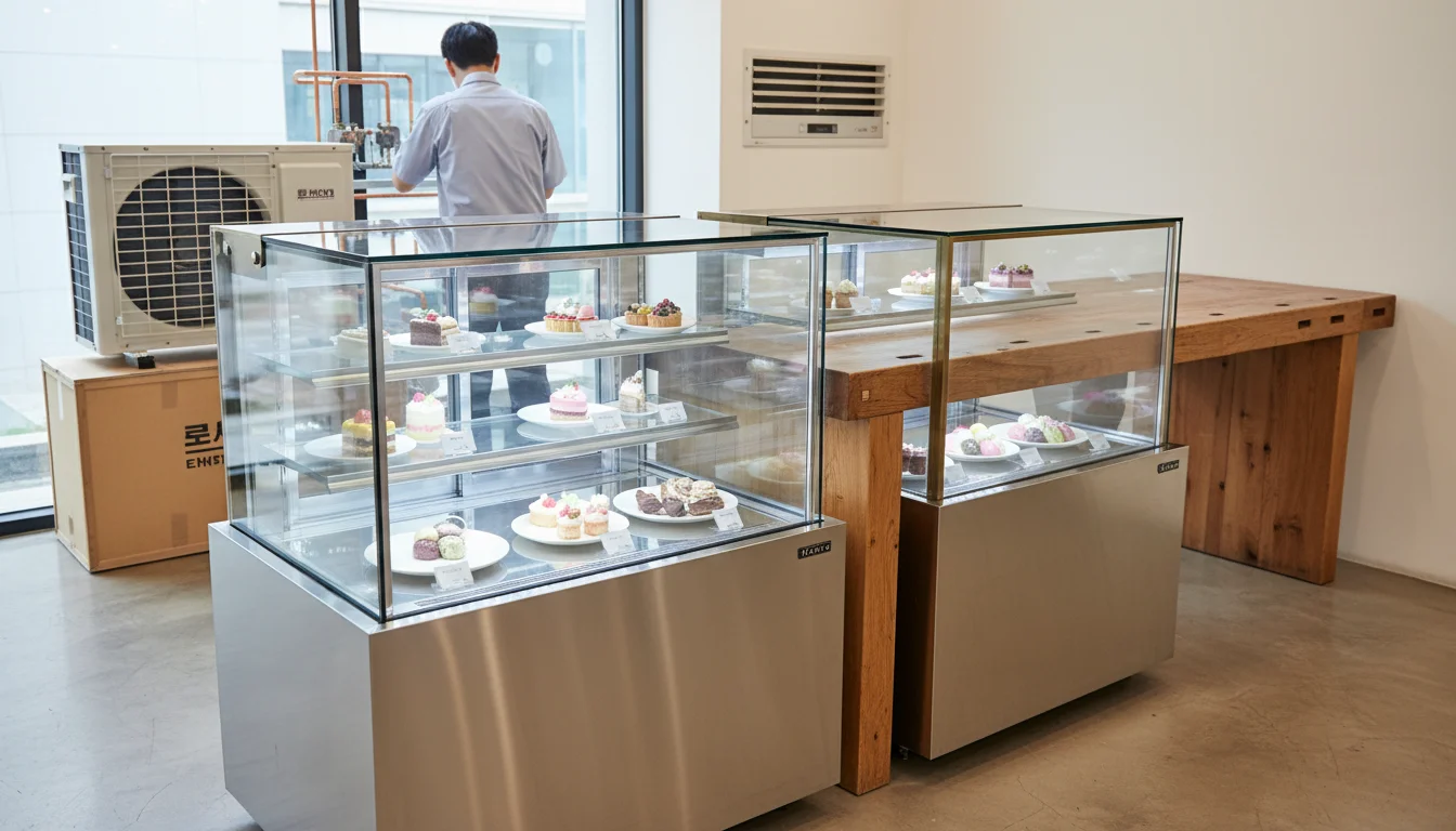 유리를 접합할 때 실리콘을 덕지덕지 바르는 것이 아니라, 고가의 UV 접합 방식을 사용하여 유리와 유리가 마치 하나처럼 이어지게 만듭니다. 시야를 가리는 장애물이 전혀 없어 디저트가 공중에 떠 있는 듯한 연출이 가능합니다. 내구성 강한 스테인리스와 고효율 콤프레셔를 사용하여 10년을 써도 처음 성능을 유지하도록 설계합니다.Q2. 다른 가게 쇼케이스는 깔끔한데, 왜 제 건 유리에 습기가 차서 안이 안 보일까요? (시안성 및 결로 제어 기술 비교)