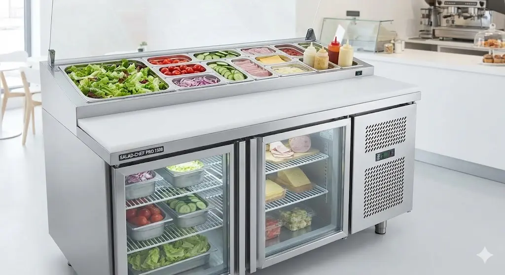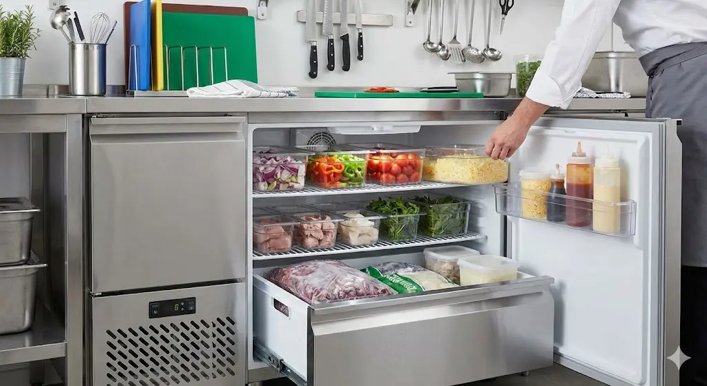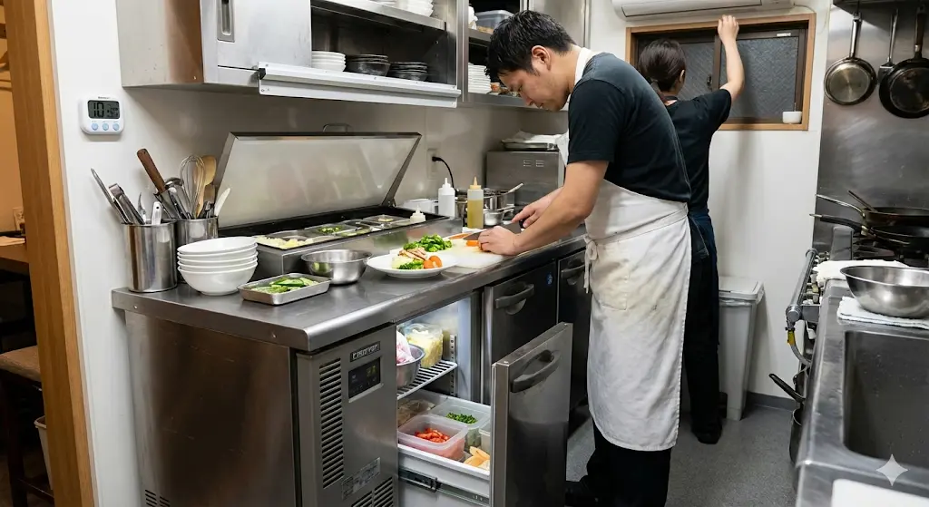 이 전략의 핵심은 테이블 냉장고 내부의 칸별 식재료 배치에 숨어 있습니다. 조리사의 숙련도만큼이나 중요한 것이 바로 '재료의 위치'이기 때문입니다.