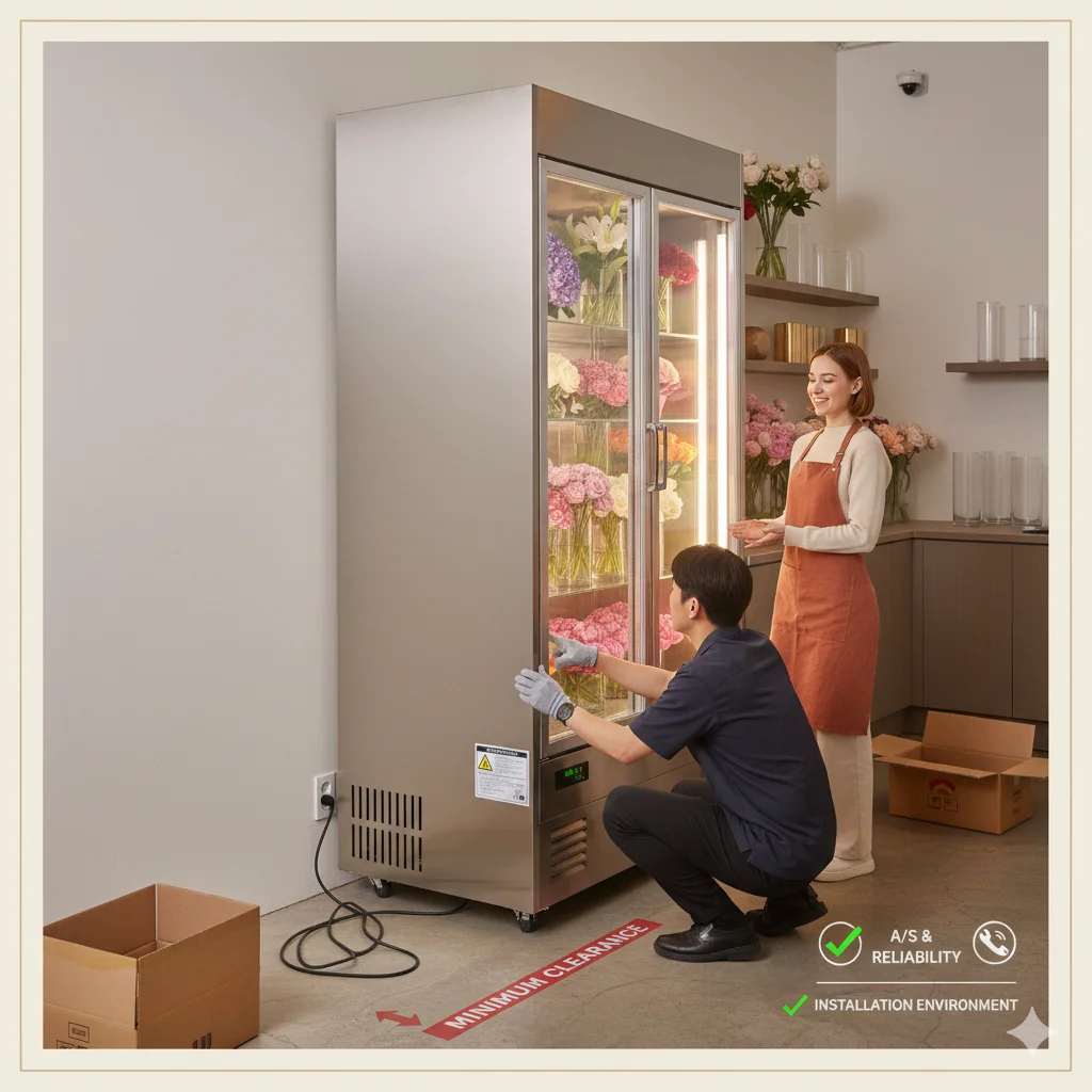 A/S 및 제조사 신뢰도: 쇼케이스는 24시간 365일 가동되어야 합니다. 고장 시 단 하루만 멈춰도 꽃 상품 전체가 손상될 수 있으므로, 신속하고 전문적인 A/S망을 갖춘 검증된 제조사 제품을 선택해야 합니다.