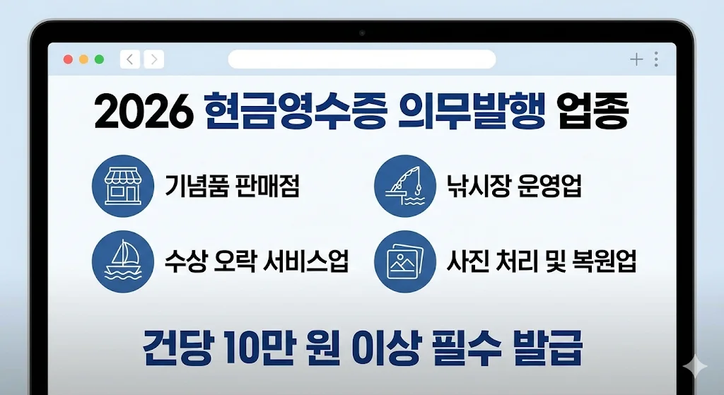 현금영수증 의무발행제도는 건당 거래금액이 10만 원 이상(부가세 포함)인 경우, 소비자가 요구하지 않더라도 무조건 현금영수증을 발급해야 하는 제도입니다. 특히 2026년부터는 그 대상이 더욱 확대되었습니다.