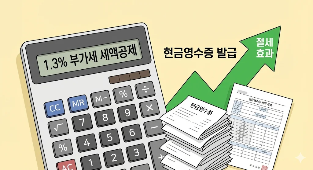 부가가치세 세액공제: 직전 연도 매출액이 10억 원 이하인 개인 사업자라면, 현금영수증 발급 금액의 1.3%(연간 1,000만 원 한도)를 부가가치세에서 직접 깎아줍니다.
