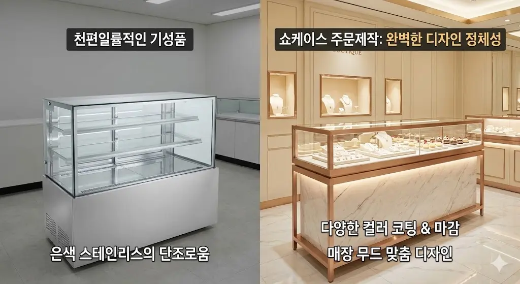 ์‡ผ์ผ€์ด์Šค์ฃผ๋ฌธ์ œ์ž‘์€ ๋งค์žฅ์˜ ์ „์ฒด์ ์ธ ์ธํ…Œ๋ฆฌ์–ด ์ปจ์…‰๊ณผ ์™„๋ฒฝํ•˜๊ฒŒ ์ผ์น˜ํ•˜๋Š” ๋””์ž์ธ ์ •์ฒด์„ฑ์„ ๊ตฌํ˜„ํ•  ์ˆ˜ ์žˆ๋‹ค๋Š” ์ ์ด ๊ฐ€์žฅ ํฐ ๋งค๋ ฅ ํฌ์ธํŠธ์ž…๋‹ˆ๋‹ค. ๊ธฐ์„ฑํ’ˆ์˜ ์ฒœํŽธ์ผ๋ฅ ์ ์ธ ์€์ƒ‰ ์Šคํ…Œ์ธ๋ฆฌ์Šค์—์„œ ๋ฒ—์–ด๋‚˜, ๋งค์žฅ ๋ฌด๋“œ์— ๋งž๋Š” ๋กœ์ฆˆ๊ณจ๋“œ, ๋ฌด๊ด‘ ๋ธ”๋ž™, ํ™”์ดํŠธ ๋“ฑ ๋‹ค์–‘ํ•œ ์ปฌ๋Ÿฌ ์ฝ”ํŒ…๊ณผ ๋Œ€๋ฆฌ์„ ๋งˆ๊ฐ์„ ์„ ํƒํ•  ์ˆ˜ ์žˆ์Šต๋‹ˆ๋‹ค.