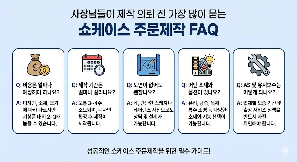 โ“ 4. ์‚ฌ์žฅ๋‹˜๋“ค์ด ์ œ์ž‘ ์˜๋ขฐ ์ „ ๊ฐ€์žฅ ๋งŽ์ด ๋ฌป๋Š” ์‡ผ์ผ€์ด์Šค์ฃผ๋ฌธ์ œ์ž‘ FAQ