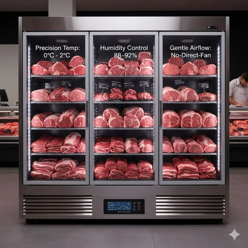 ๊ณ ๊ธฐ ์ƒ‰์ด ๋ณ€ํ•˜๋Š” ์†๋„๋Š” ์˜จ๋„์™€ ์Šต๋„์— ๋งค์šฐ ๋ฏผ๊ฐํ•ฉ๋‹ˆ๋‹ค. ์ •์œก์  ๋ƒ‰์žฅ๊ณ ๋Š” ๋‹จ์ˆœํ•œ ๋ƒ‰๊ฐ์ด ์•„๋‹Œ, 0ยฐC์—์„œ 5ยฐC ์‚ฌ์ด์˜ ๋งค์šฐ ์ข์€ ๋ฒ”์œ„์—์„œ ์˜ค์ฐจ ์—†์ด ์ •๋ฐ€ํ•˜๊ฒŒ ์˜จ๋„๋ฅผ ์œ ์ง€ํ•  ์ˆ˜ ์žˆ์–ด์•ผ ํ•ฉ๋‹ˆ๋‹ค.