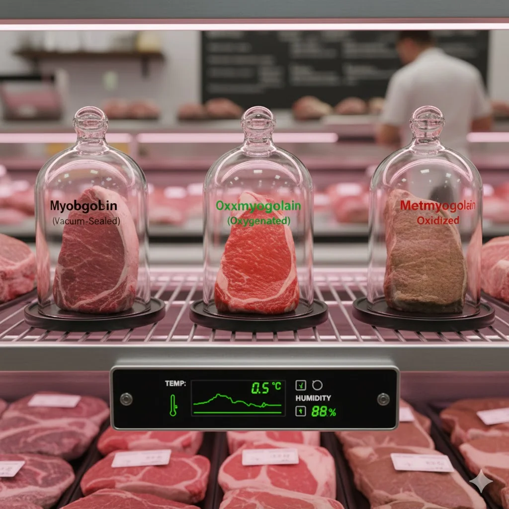 ํ์ง๋ง ์ ์ก์ ๋์ฅ๊ณ ๋ด๋ถ์ ์จ๋๋ ์กฐ๋ช , ์ต๋ ๋ฑ ํ๊ฒฝ ์กฐ๊ฑด์ด ๋ถ์์ ํ๋ฉด ์ฅ์๋ฏธ์ค๊ธ๋ก๋น์ด ์ฐํ๋์ด ๊ฐ์๋น์ ๋ฉํธ๋ฏธ์ค๊ธ๋ก๋น(Metmyoglobin)์ผ๋ก ๋ณํฉ๋๋ค. ์ด๊ฒ์ด ๋ฐ๋ก ๊ณ ๊ธฐ๊ฐ '์์ด ๋ณํ๋ค'๊ณ ๋๋ผ๋ ๊ฐ๋ณ ํ์์ ๋๋ค.