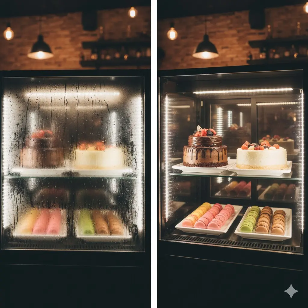 • ์—ด์„  ์ฒ˜๋ฆฌ: ํ”„๋ฆฌ๋ฏธ์—„ ์นดํŽ˜ ๋ƒ‰์žฅ ์‡ผ์ผ€์ด์Šค์—๋Š” ์œ ๋ฆฌ์— ์—ด์„ ์ด ๊น”๋ ค ์žˆ์–ด ์Šต๊ธฐ๋ฅผ ์ž๋™์œผ๋กœ ๋ง๋ ค์ฃผ๋Š” ๊ธฐ๋Šฅ์ด ์žˆ์Šต๋‹ˆ๋‹ค.