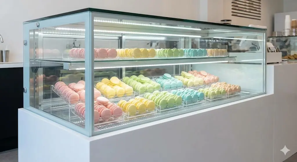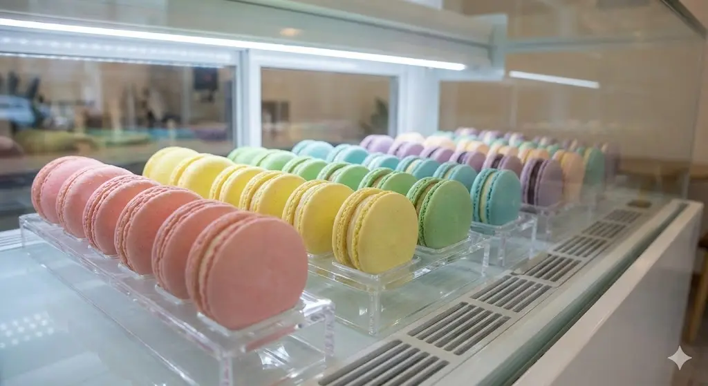 ๋งˆ์นด๋กฑ ์‡ผ์ผ€์ด์Šค๋งŒ์˜ ํ•ต์‹ฌ ๋ฉ”์ปค๋‹ˆ์ฆ˜๊ณผ ๋งค์ถœ์„ ๊ทน๋Œ€ํ™”ํ•˜๋Š” ์ง„์—ด ์ „๋žต๐Ÿ” Part 1. ์Šต๋„์˜ ๋ฏธํ•™: ๋ˆ…๋ˆ…ํ•จ๊ณผ ๋”ฑ๋”ฑํ•จ ์‚ฌ์ด์˜ ๊ณจ๋“  ํƒ€์ž„Q1. ๋งˆ์นด๋กฑ์„ ์ผ๋ฐ˜ ์ผ€์ดํฌ์šฉ ๋ƒ‰์žฅ๊ณ ์— ๋ณด๊ด€ํ•˜๋ฉด ์™œ ์•ˆ ๋˜๋‚˜์š”?Q2. '๋ƒ‰๋™ ๋ณด๊ด€' ํ›„ ์‡ผ์ผ€์ด์Šค๋กœ ์˜ฎ๊ธธ ๋•Œ ์ฃผ์˜ํ•  ์ ์€ ๋ฌด์—‡์ธ๊ฐ€์š”?โœจ Part 2. ์‹œ๊ฐ์  ์œ ํ˜น: 'ํ”„๋ ˆ'์™€ '์ปฌ๋Ÿฌ'๋ฅผ ์‚ด๋ฆฌ๋Š” ์ง„์—ดQ3. ๋งˆ์นด๋กฑ์˜ 'ํ”„๋ ˆ(Feet)'๋ฅผ ๋‹๋ณด์ด๊ฒŒ ํ•˜๋Š” ์ง„์—ด ๊ฐ๋„๊ฐ€ ๋”ฐ๋กœ ์žˆ๋‚˜์š”?Q4. ์•Œ๋ก๋‹ฌ๋กํ•œ ๋งˆ์นด๋กฑ ์ƒ‰๊ฐ์ด ์กฐ๋ช… ๋•Œ๋ฌธ์— ์™œ๊ณก๋˜์–ด ๋ณด์ž…๋‹ˆ๋‹ค.๐ŸŽจ Part 3. ์ตœ์‹  ํŠธ๋ Œ๋“œ: ๊ณต๊ฐ„์˜ ๋ฏธํ•™์„ ์™„์„ฑํ•˜๋Š” ๋””์ž์ธQ5. ์š”์ฆ˜ ์ธ๊ธฐ ์žˆ๋Š” ๋งˆ์นด๋กฑ ์ „๋ฌธ์ ๋“ค์€ ์–ด๋–ค ๋””์ž์ธ์„ ์„ ํ˜ธํ•˜๋‚˜์š”?๐Ÿ› ๏ธ Part 4. ์ง€์† ๊ฐ€๋Šฅํ•œ ๊ฒฝ์˜: ์—๋„ˆ์ง€ ํšจ์œจ๊ณผ ๊ด€๋ฆฌQ6. ์ž‘์€ ์žฅ๋น„์ธ๋ฐ๋„ ์ „๊ธฐ์„ธ๊ฐ€ ๊ฝค ๋‚˜์˜ต๋‹ˆ๋‹ค. ์ ˆ์•ฝ ๋ฐฉ๋ฒ•์ด ์žˆ์„๊นŒ์š”?๐Ÿ ๋งˆ์นด๋กฑ ์‡ผ์ผ€์ด์Šค ๊ตฌ๋งค ์ „ ์ตœ์ข… ์ฒดํฌ๋ฆฌ์ŠคํŠธ