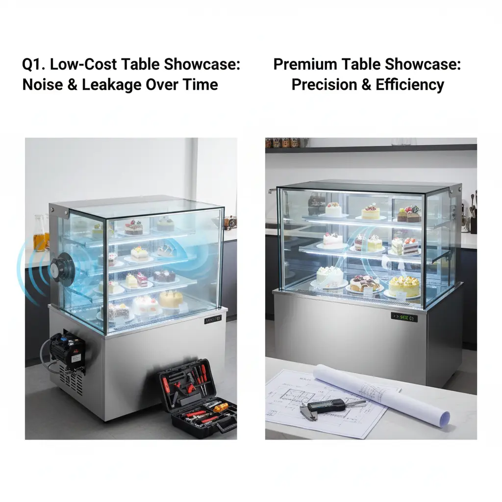 Q1. 왜 저가형 테이블쇼케이스는 시간이 지나면 소음이 커지고 냉기가 샐까요?