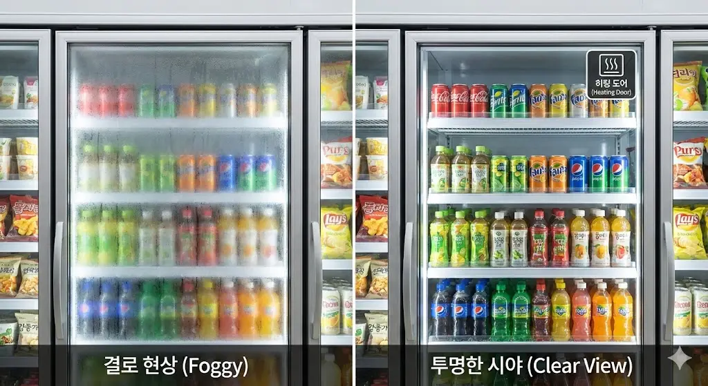 결로 방지(히팅 도어): 외부와 내부 온도 차이로 인한 습기를 막아 항상 투명한 유리를 유지하는 기능이 필수랍니다.
