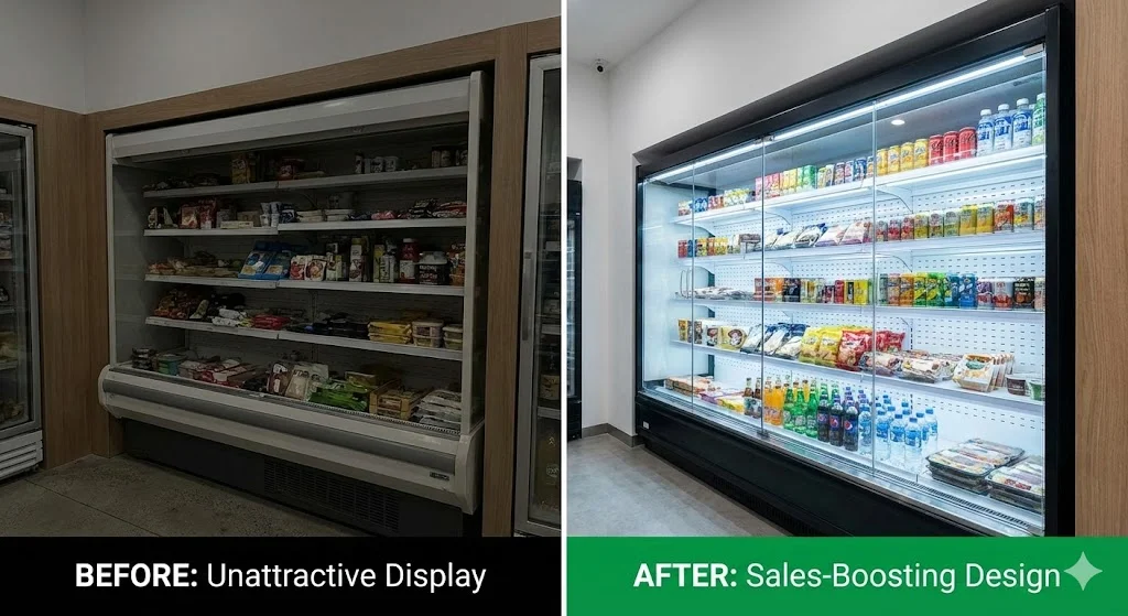 고휘도 LED 조명: 상품을 더욱 선명하고 먹음직스럽게 보여주는 밝은 LED 조명이 사각지대 없이 설치되어 있어야 매출로 이어진다는 점, 꼭 기억해 주세요.